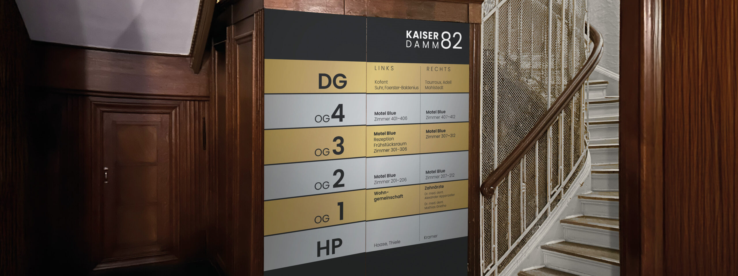 Bei dem zentral gelegenen Berliner Objekt Kaiserdamm 82 handelt es sich um einen ehrwürdigen und sehr repräsentativen Altbau mit einer Mischnutzung: als Motel, Wohnhaus und einer Zahnärzte-Wohngemeinschaft. Die genaue Übersicht und Lokalisierung der unterschiedlichen Mieter und Einrichtungen wird außen im Eingangsbereich und innen im Treppenhaus und im Fahrstuhl mit Hilfe eines „stillen Portiers“ jederzeit und übersichtlich angezeigt. Eine dezente, moderne und edle Gestaltung sorgt für Klarheit bei der Wegeführung. Sie entspricht dem soliden Charakter des Gebäudes.